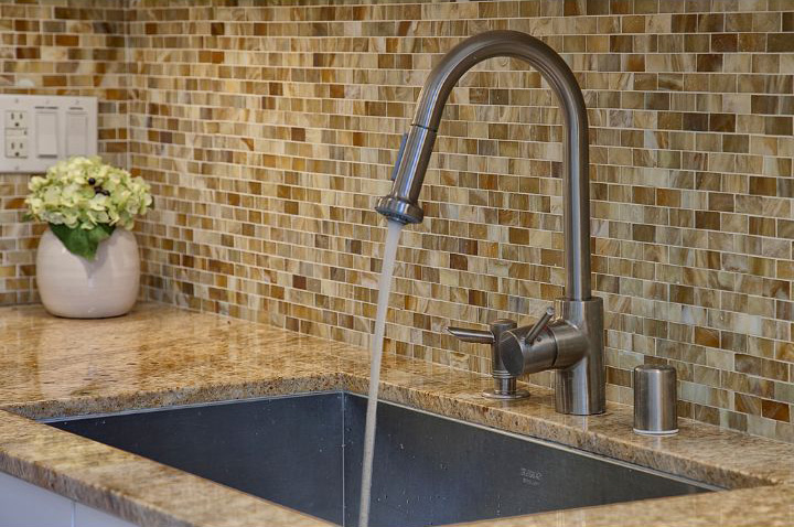 This luxurious mosaic backsplash tile complements the rich granite countertop, creating a focal point in the kitchen. The tile’s color variations tie together the kitchen’s overall palette, while under-counter lighting highlights its patterns and tones. — Our Bellevue Classy Condo included this tasteful choice of backsplash tile, which was shown in an article on countryliving.com.
